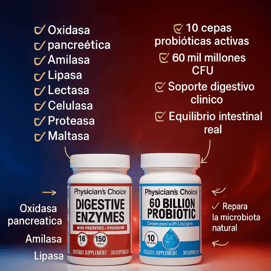ENZIMAS DIGESTIVAS + PROBIÓTICOS CLÍNICOS QUE ENSEÑAN A TU CUERPO A PROCESAR LOS ALIMENTOS SIN INFLAMARSE NI ALMACENAR GRASA.(PAGA 1 Y LLEVA 2)