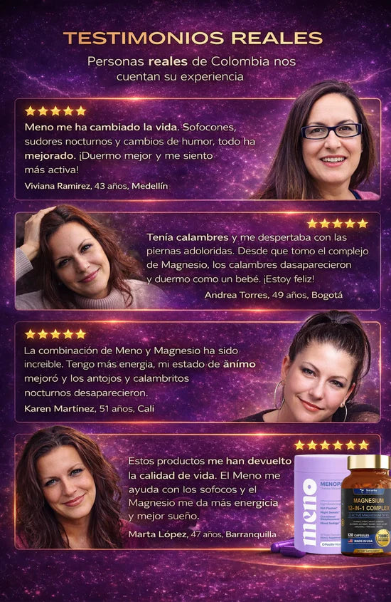 MENO + MAGNESIO trabajan juntos para atacar la raíz real de tus síntomas: el desbalance hormonal y la deficiencia de magnesio que aparecen después de los 40.