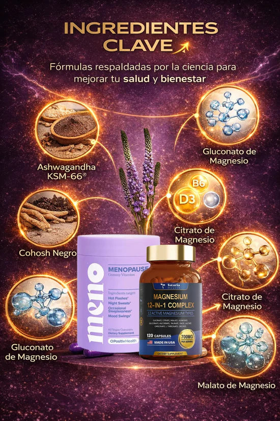 Tanto MENO como MAGNESIO 12 en 1 están formulados con ingredientes naturales y seguros, lo que permite que sean compatibles con otros tratamientos médicos o suplementos (como terapia hormonal, vitaminas o medicamentos para la tiroides).