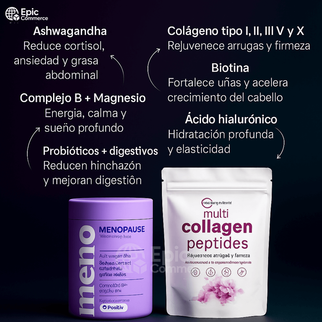 ✅EL COMBO que elimina los sofocos, desinflama la barriga, reactiva tu metabolismo y además repara todo lo que la menopausia te estaba quitando: cabello, uñas, piel, colágeno, articulaciones… TODO.