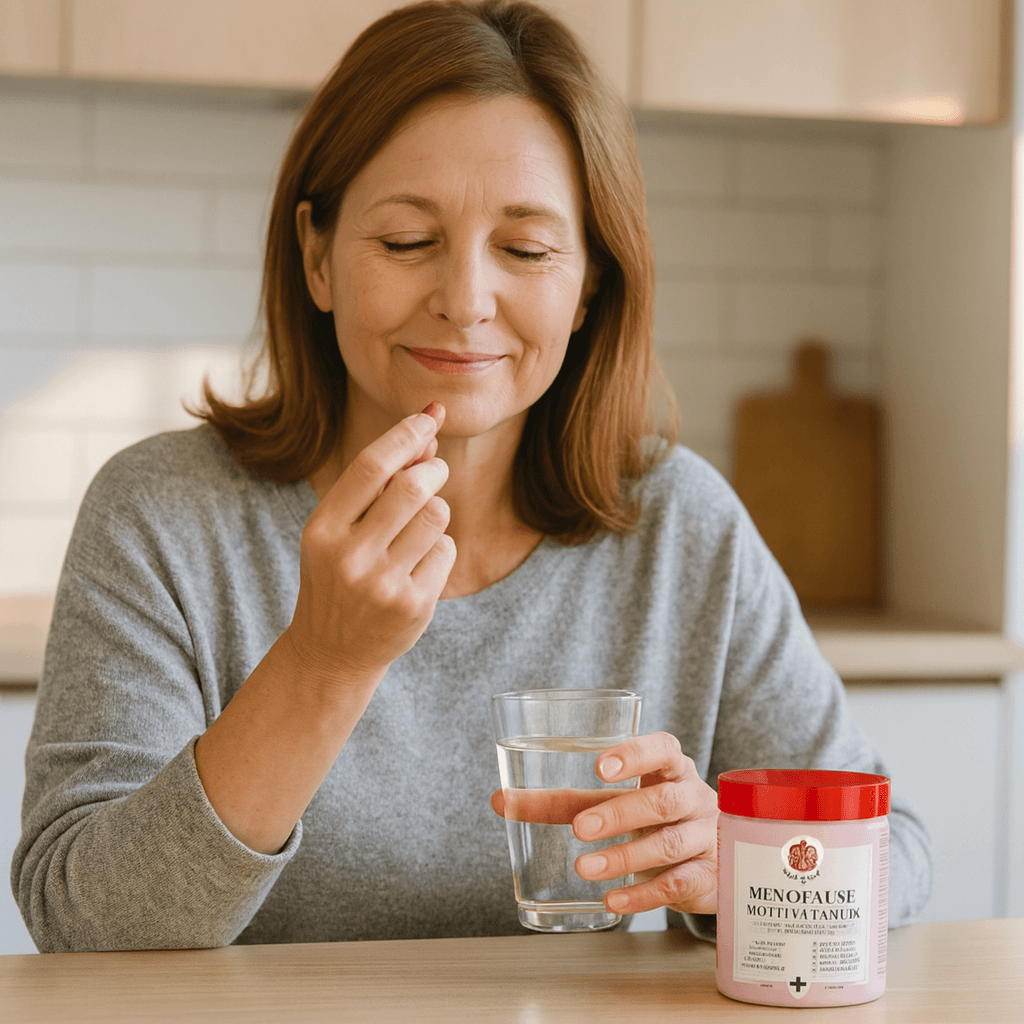 Nuestra fórmula de apoyo a la menopausia 21 en 1 se centra en los sudores nocturnos con tres ingredientes clave: el Cohosh negro ayuda a equilibrar las fluctuaciones hormonales que desencadenan episodios de calor, el trébol rojo favorece la regulación natural de la temperatura y el glicinato de magnesio promueve un sueño más tranquilo y reparador.