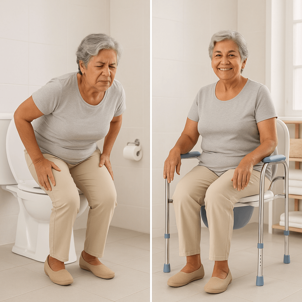 ✅ Directamente sobre el inodoro: solo retira la vasija y coloca la silla encima del sanitario. Funciona como soporte de altura y seguridad, evitando esfuerzo y riesgo al sentarse o levantarse.